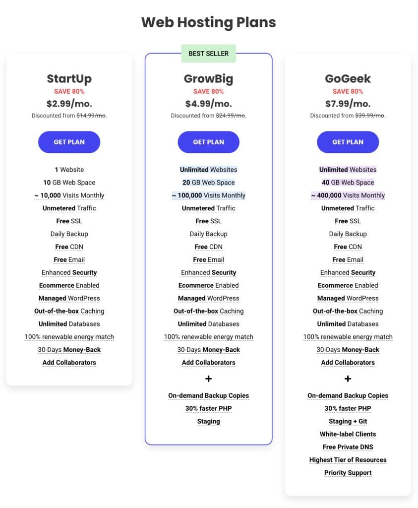 Siteground一共有三个Wordpress主机套餐: