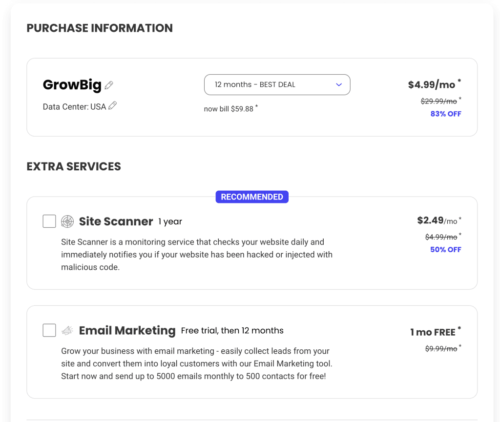 还有两项附加服务,一个是站点扫描,相当于给网站安装一个杀毒软件。另一个是邮件营销工具。这个可以根据需求选择。如果在这里不选择,完成购买以后,也可以在自己账户里面加购。
