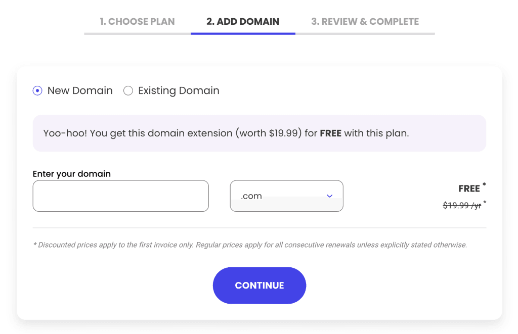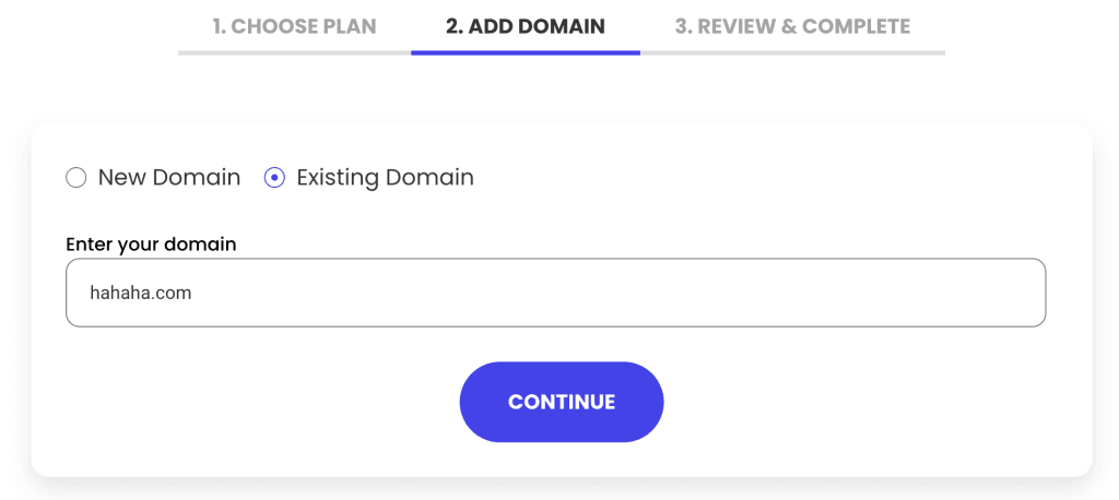 点击”GET PLAN”后进入购买Siteground套餐的第二部,添加域名。