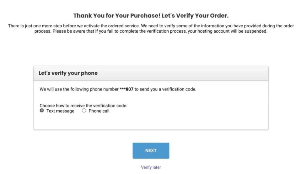 Siteground对订单真实性的核实是比较严格的,所以在信用卡扣款之后,还需要进一步验证订单。具体说就是验证上一步中填写的手机号。